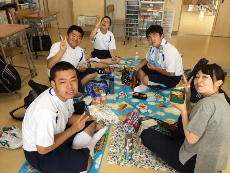 学校に戻ってからは、学級ごとに遠足気分で弁当を食べました。