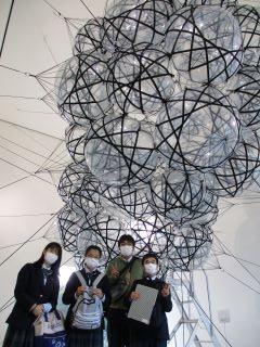 (左から1枚目十和田市現代美術館チェ・ジョンファ「フラワーホース」、2枚目、トマス・サラセーノ「オン・クラウズ(エア-ポート-シティ)」の前で撮影。)
